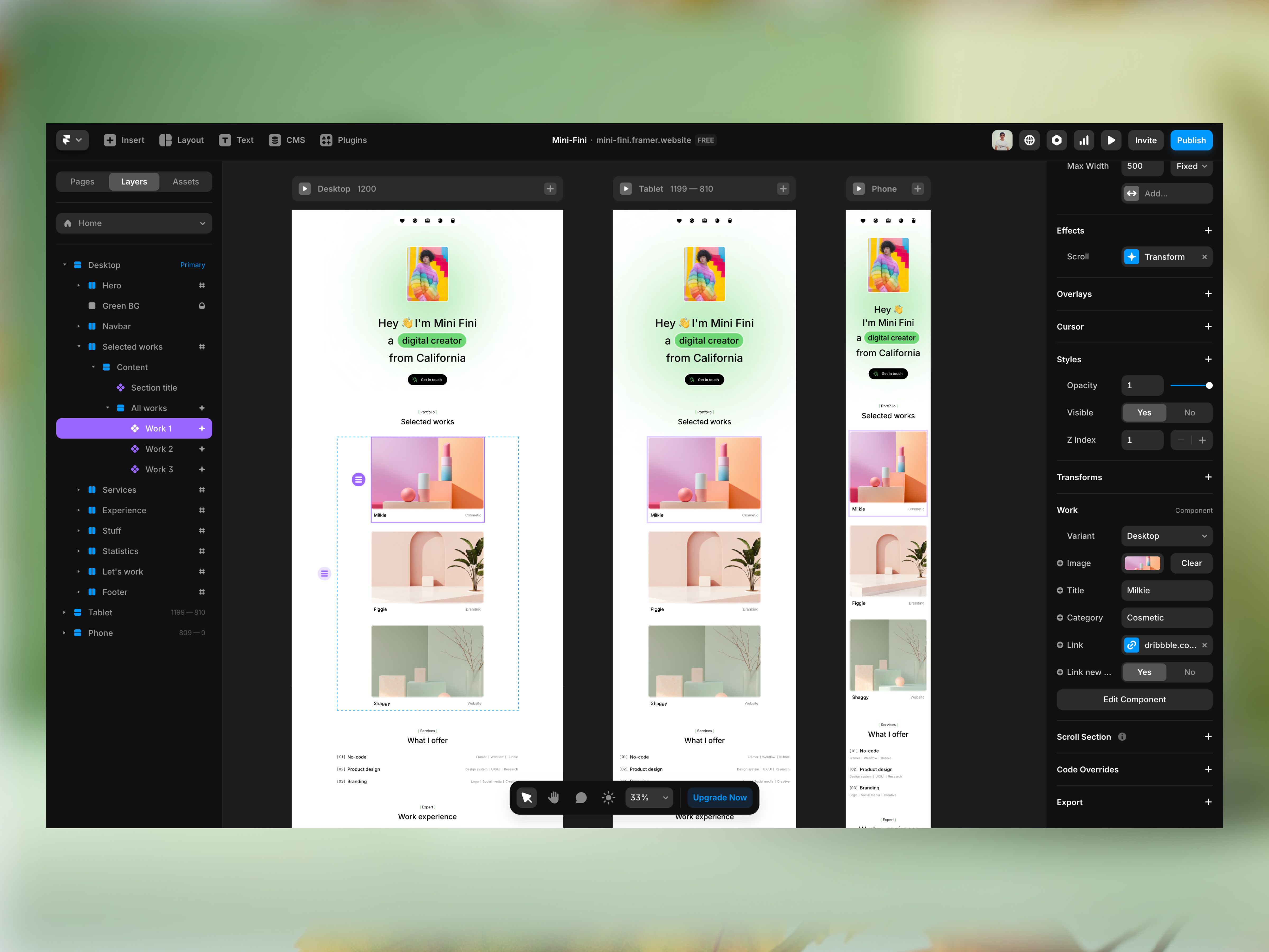 Mini Fini – A Bold & Playful One-Page Portfolio Mini Fini is a sleek and modern one-page portfolio template designed for creatives, designers, and freelancers who want to showcase their work with style. With smooth animations, bold typography, and a minimalist layout, this Framer-built template delivers an engaging and interactive experience that keeps visitors focused on what matters most—your work. Why Choose Mini Fini? ✅ Eye-Catching Design – A perfect balance of playfulness and professionalism, designed to leave a lasting impression.✅ Seamless Animations – Smooth scroll effects and hover interactions create an engaging user experience.✅ Fully Responsive – Optimized for all screen sizes, ensuring a flawless experience on desktop and mobile.✅ Customizable & Easy to Edit – Built on Framer, making it effortless to adjust colors, fonts, and layouts to match your brand.✅ Lightning-Fast Performance – Optimized for speed to ensure quick loading times and a smooth browsing experience. Perfect For: 🎨 Designers📸 Photographers🖌️ Artists💼 Freelancers🚀 Creatives of all kinds Whether you're launching your personal brand or refreshing your online presence, Mini Fini gives you the perfect platform to tell your story in a bold and stylish way. Start creating today with this modern one-page portfolio template! If you need any help, contact me:[email protected]