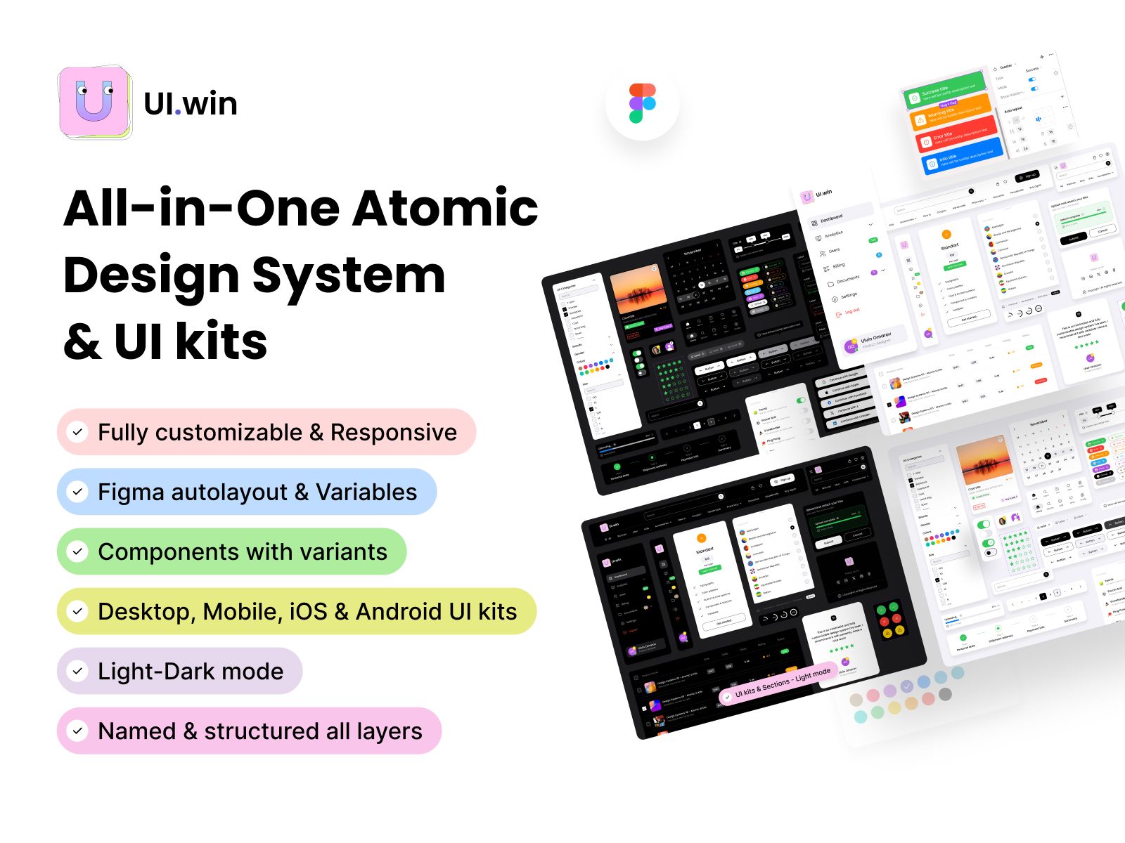 UI-win is your ultimate multipurpose Atomic Design System, featuring a comprehensive collection of UI kits. All these kits are designed with Figma auto layout that allows users to use fully responsive.Considering trends, the system is designed in both Light and Dark modes, so it is easy to use to drag and drop and change all of them to different modes.Web kits are separated into desktop and mobile, while App kits are in Material and iOS. At the same time, global styles are applied with variables.The Design System consists of- Typography- Color palettes- Tooltips, Toasters- Button sets- Input-Text fields- Avatars- Tabs- Checkboxes- Radio boxes- Toggles- Switches- Steppers- Tags- Chips- Progress bars- Sliders- Emojis- Navbars-Menubars- Calendar- Date & Time pickers- Breadcrumbs- Upload files- Searches- Accordions- Paginations- Snack bars- Loading-Progress indicators- Notifications- Cards- Popup-Dialogues- Testimonial- Pricing- Order card- Filters- Sidebar (dashboard)- Table (dashboard)- Dashboard section- Headers- Footers- Mobile modals- Navigation drawer- Hero section samples- Signup, Login- Check out, Cart- Write review- FAQ (Q&A)- Team members- Product list- Fluid & Fixed grids- 4000 over icon setSupercharge your UI/UX workflow with UI-win and create stunning interfaces efficiently and precisely. Elevate your design projects with ready-to-use kits and unleash limitless creativity.Thank you for your purchase!We appreciate your support in every UI color: 💜🩵💙💚💛🧡❤️🩷🤍🩶🖤