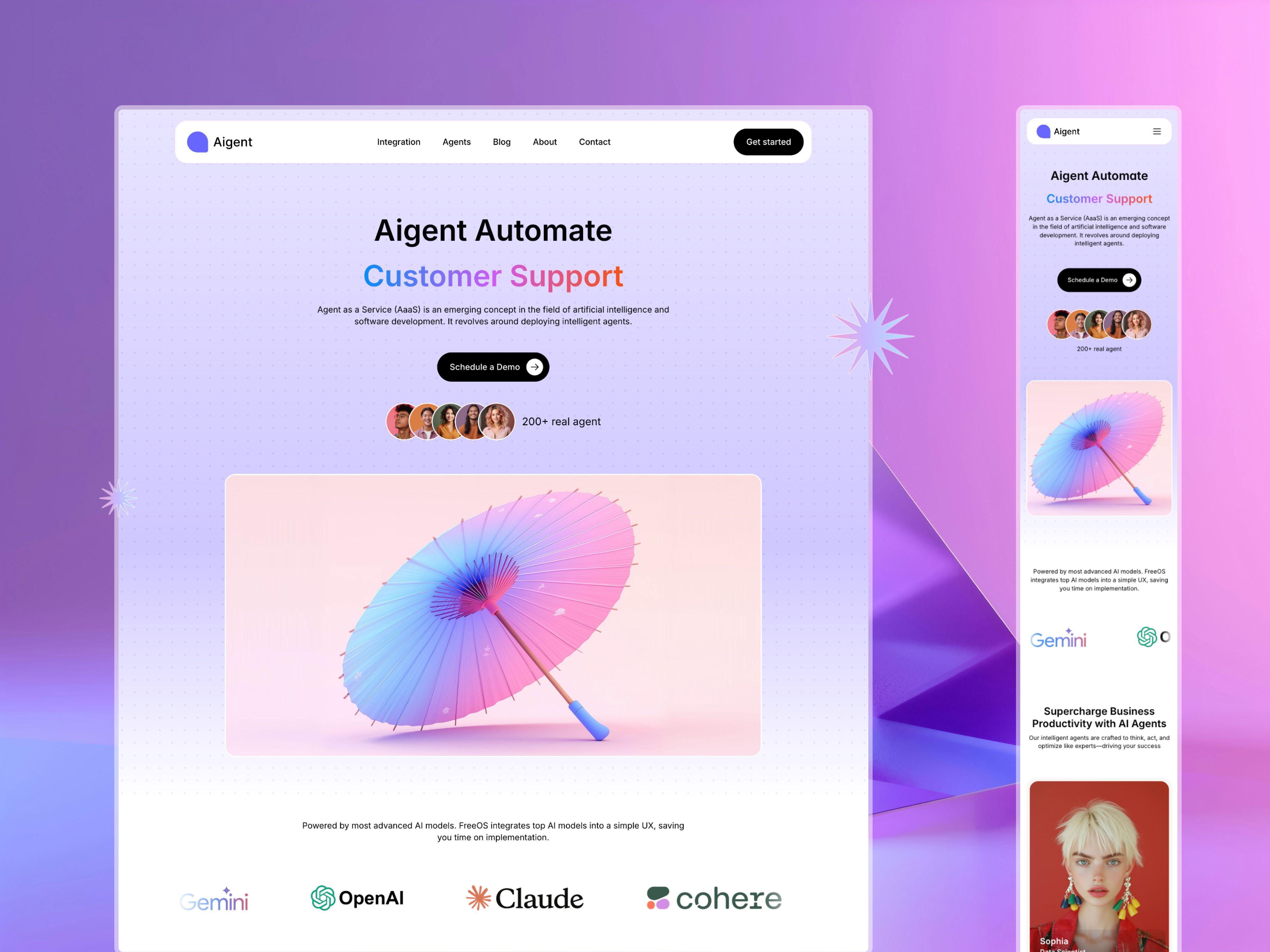 Aigent is the Framer template for businesses and startups looking to create and scale AI-powered agents. With its sleek design and intuitive layout, this template offers everything you need to showcase your AI solutions and connect with your audience. The template consists of the following pages: HomeIntegration Tools (CMS)AgentsContactAboutBlogs (CMS)Privacy policySecurity policyTerms of use404 Features include: Fully customizable layouts to match your branding.Seamless integration sections for showcasing tools and technologies.User-friendly UX to enhance visitor engagement.Dedicated pricing and testimonials pages to boost trust and conversions.Pre-written content to save you time while maintaining a professional tone. Whether you're launching a new AI product or enhancing your online presence, Aigent simplifies the process, letting you focus on growing your business. Start building smarter workflows today! Discounts: Use partner25proyearly coupon code for 3 months free yearly Pro subscription Contact me if you need any help or setup: [email protected]